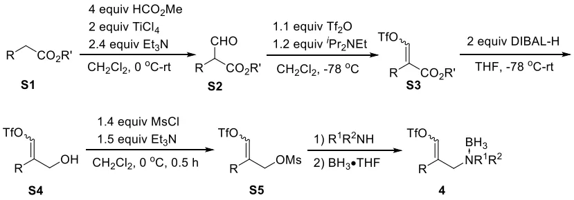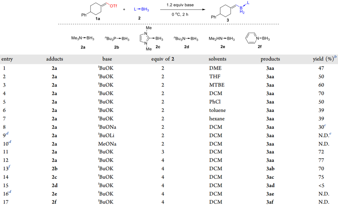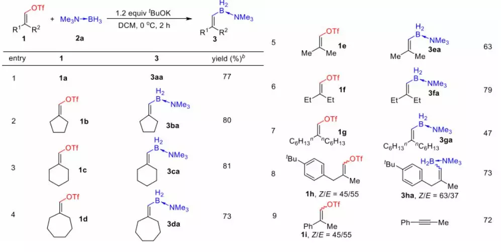 在先前的研究基礎上,作者設想如果硼烷加合物能夠捕獲原位生成的卡賓中間體,那么隨后的B-H插入反應就能夠得到烯基硼化合物。基于這樣的設想,作者首先考察了烯基三氟甲磺酸酯1a與三甲胺-硼烷2a在叔丁醇鉀存在下,DME為溶劑,0℃下的反應,最終能夠以47%的收率得到目標烯基硼化合物3aa(圖3-entry1),主要的副產物是叔丁醇鉀捕獲卡賓中間體生成的O-H插入產物。之后作者先后考察了溶劑、堿、投料比以及不同種類的硼烷加合物對反應的影響,當以DCM為溶劑、叔丁醇鉀為堿,以三甲胺-硼烷加合物為底物并增加至4當量時,反應能以77%的收率得到目標化合物(圖3-entry12)。