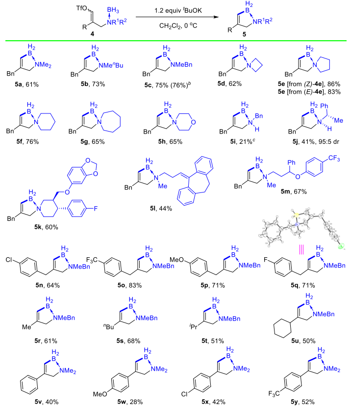 除分子間反應外,分子內卡賓插入B-H鍵的反應也能順利發生,得到一系列B-N雜環化合物(圖5)。底物中的胺部分可以是鏈狀或環狀的三級脂肪胺,能以中等到優秀的收率得到相應的烯基硼烷加合物(圖5-5a-5h,5k-5m);二級脂肪胺也能給出目標產物,但反應效率明顯下降(圖5-5i-5j)。對于底物中的烯基部分,無論是烷基或環烷基取代,還是含有給電子或吸電子取代基的芳基取代或芐基取代,反應均能順利或高效發生(圖5-5n-5y)。比較新穎的是,當底物中的胺部分為環狀時,可以生成B-N雜螺環化合物,這是一類還未報道過的分子結構(圖5-5d-5h);此外,將一些藥物分子如帕羅西汀、去甲替林和氟西汀做成相應的硼烷加合物引入到該反應中,也能高效地得到目標烯基硼烷加合物(圖5-5k-5m),說明該方法有望用于藥物分子的修飾和改造。