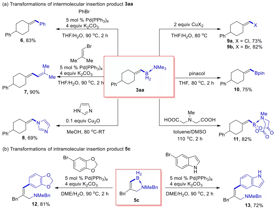 在這項研究中,作者首次通過不飽和卡賓對B-H鍵的插入反應,實現了C(sp2)-B鍵的高效構建。當采用分子內的B-H鍵插入反應策略時,可以得到一系列B-N雜環化合物,后續的衍生化實驗證明,這些雜環化合物是有機合成中非常理想的合成砌塊。此外,這項研究將不飽和卡賓化學和有機硼化學聯系起來,為有機硼化合物的多樣性合成提供了新思路。