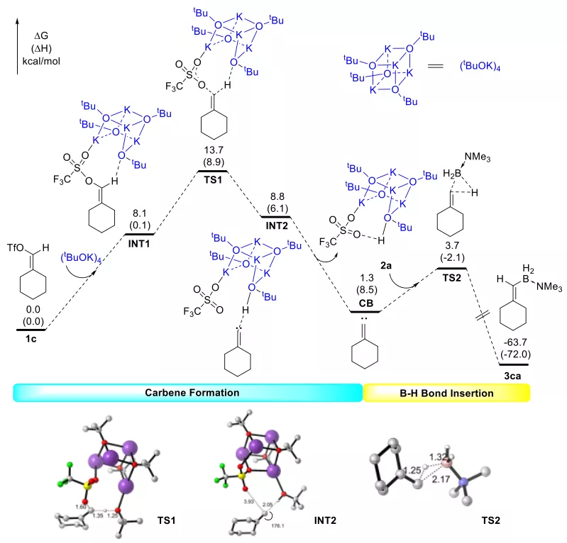 最后,基于DFT計算,作者給出了可能的反應機理(圖7)。首先是烯基三氟甲磺酸酯底物在叔丁醇鉀的作用下經脫質子、α-消除作用原位生成不飽和卡賓中間體(CB),其中脫質子的過程能壘較高(TS1),有可能是反應的決速步(動力學同位素效應實驗也支持該結論)。隨后,該不飽和卡賓對B-H鍵的插入生成目標產物(3ca),該過程可能經三元環過渡態的協同機理進行(TS2)。